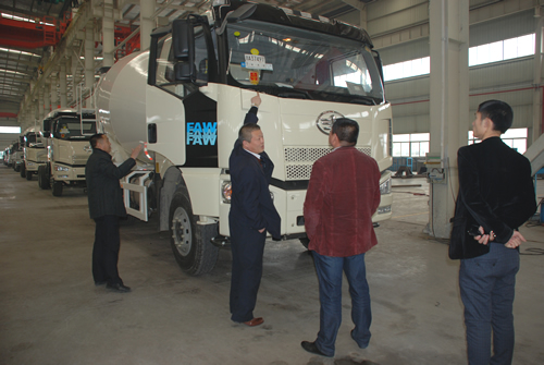 (上圖為客戶現(xiàn)場參觀考察攪拌車生產(chǎn)過程)